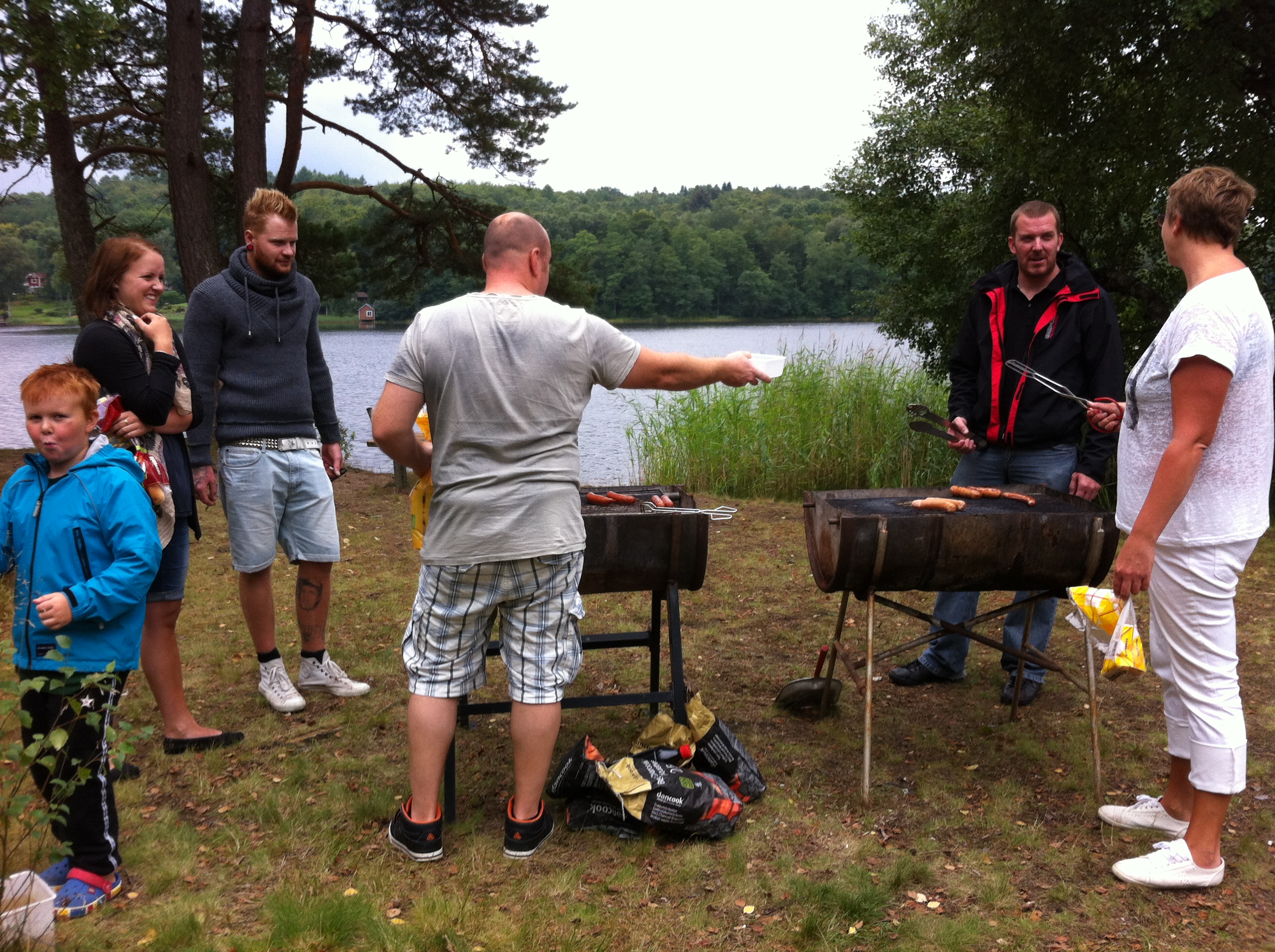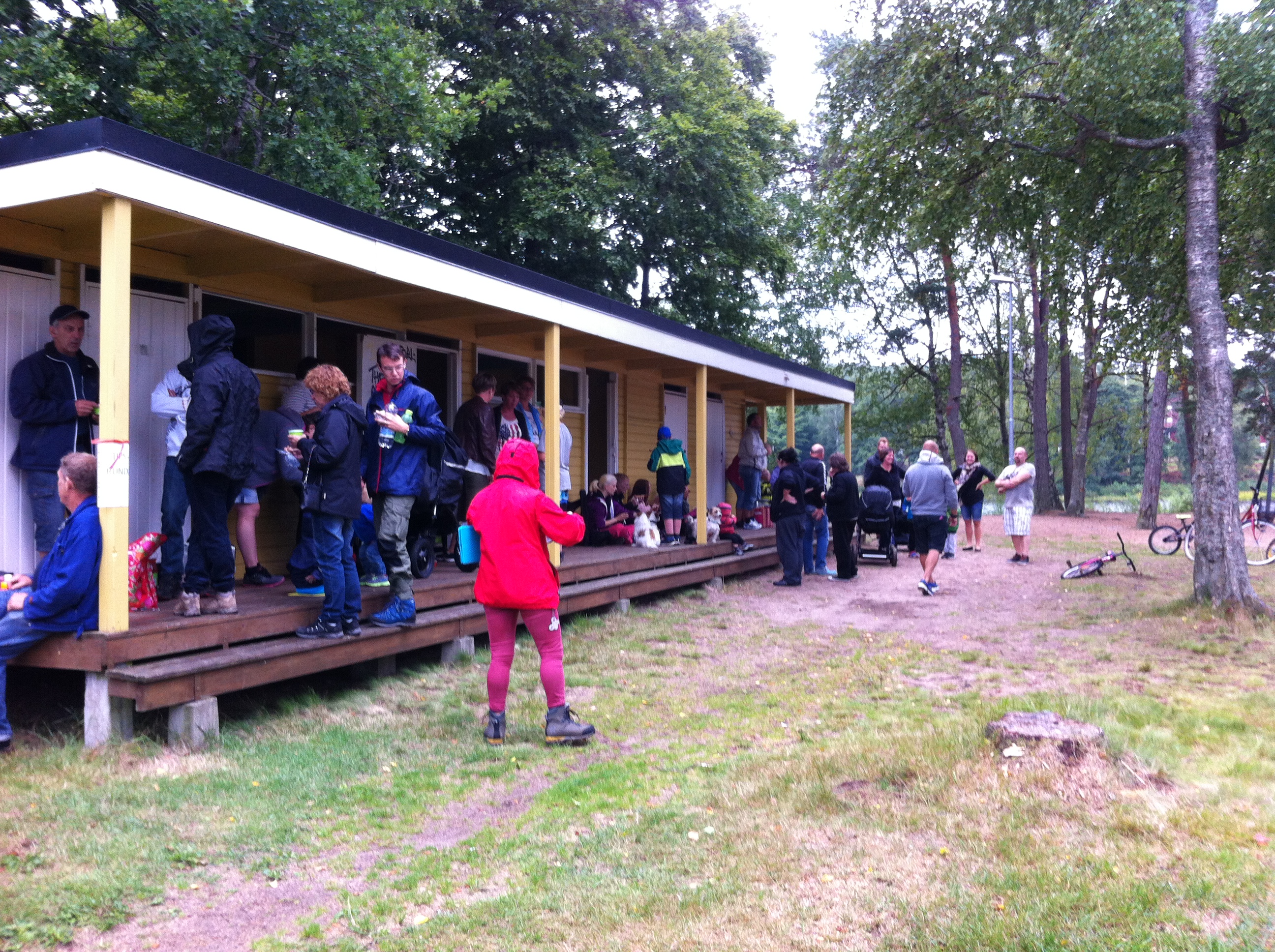 När grillarna var tända och korven på  plats kom självklart regnet på visit…..